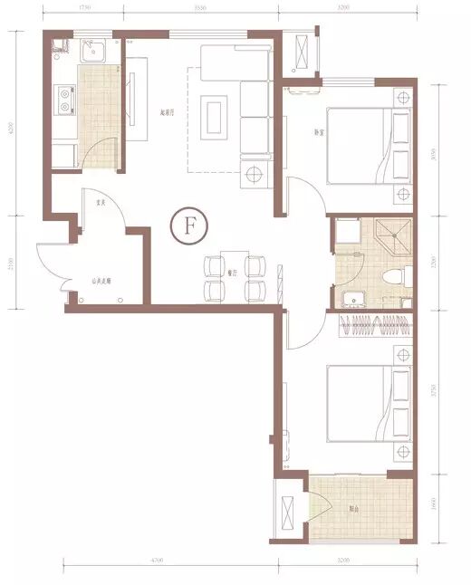 户型名称:F户型约80平米主卧朝南,且带阳台,有利好的采光;