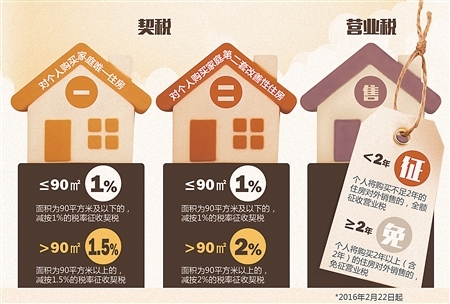 财政部、国家税务总局、住建部昨日联合发布《关于调整房地产交易环节契税营业税优惠政策的通知》,自2月22日起,调整房地产交易环节契税与营业税(详见制图).