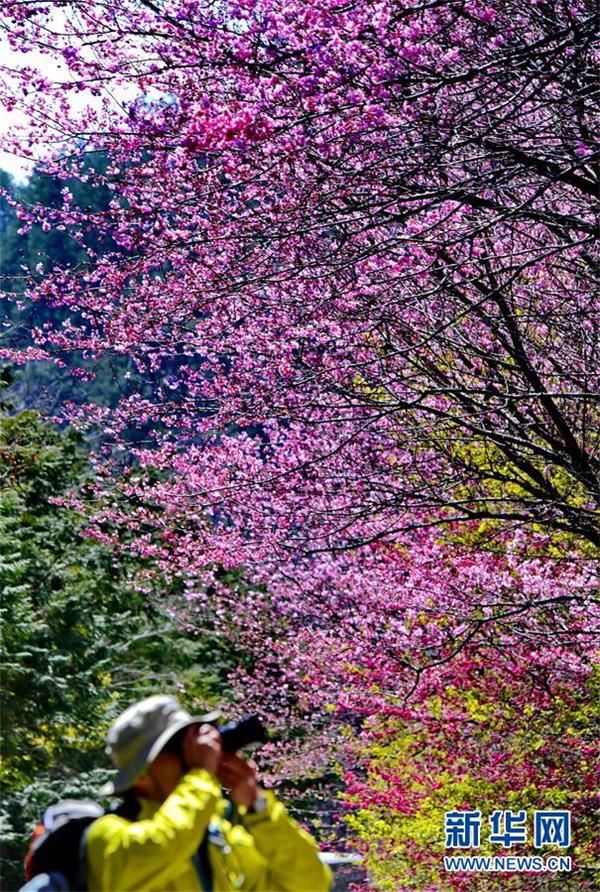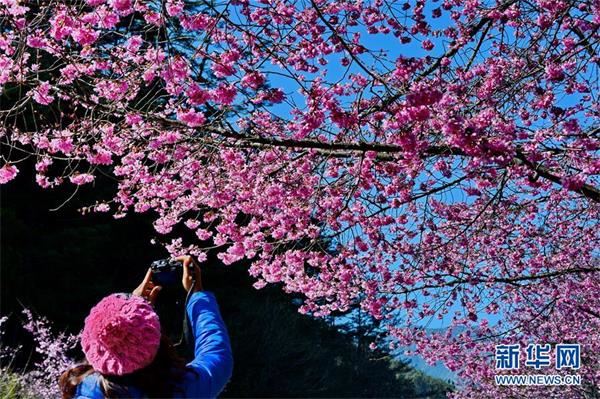 2月29日,游客在武陵农场赏花拍照。初春的台湾,气温回升,位于海拔1700多米的台中武陵农场,漫山遍野的樱花竞相开放,美不胜收,吸引了四面八方的游客前来观赏。 新华社记者张国俊摄
