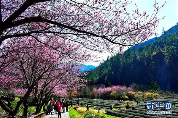 2月29日,游客在武陵农场茶园观赏樱花。初春的台湾,气温回升,位于海拔1700多米的台中武陵农场,漫山遍野的樱花竞相开放,美不胜收,吸引了四面八方的游客前来观赏。 新华社记者张国俊摄