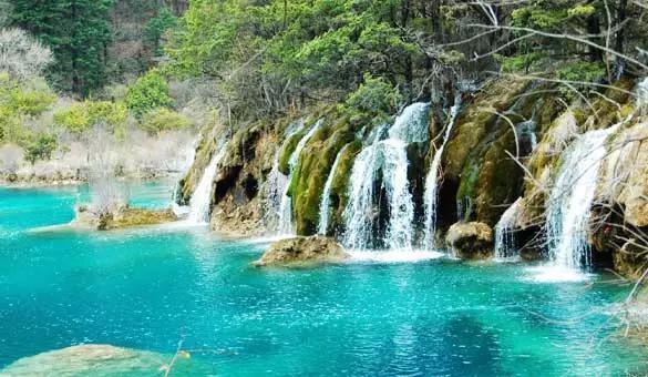 九寨沟瀑布群,则从长满树木的悬崖或滩上悄悄流出,瀑布往往被分成无数股细小的水流,或轻盈缓慢,或急流直泻,千姿百态,妙不可言。