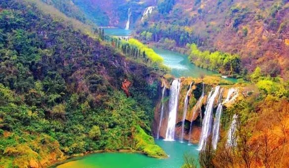 其中最大一级瀑布高56米,宽110米,号称九龙第一瀑,也称“神龙瀑”。丰水季节远在数里之外即可听到水声巨响,近前仰观,瀑流恰似天河泄落,雾气升腾,势若雷霆万钧。