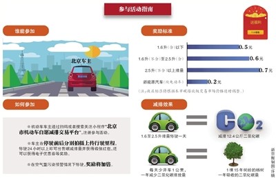 该活动由北京市发改委联合北京环境交易所、北京节能低碳工程技术研究院、腾讯公司等单位组织开展。据程序开发方相关负责人介绍,机动车车主可通过扫码或者搜索关注小程序“北京市机动车自愿减排交易平台”,注册参与活动。车主在停驶前后分别拍摄上传行驶里程,停驶24小时以上即可出售碳减排量并获得微信红包,还可以获得电子优惠券等奖励,在空气重污染预警的情况下停驶,奖励还将加倍。