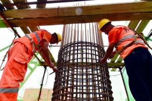工人们在万泉河桥匝道施工现场进行桩基作业。