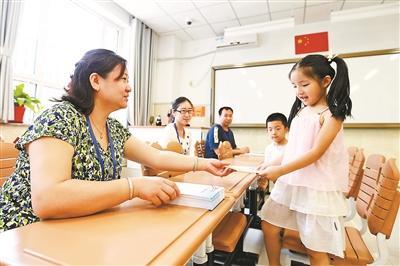 北青报记者在地坛小学看到,刚到八点半,一对对家长和孩子手拿适龄儿童全家户口、家庭实际居住地证明以及《学龄人口信息采集表》等需要携带的材料陆续走进该校进行入学登记。据了解,地坛小学“幼升小”入学登记共分为三个环节,首先家长们需要在等候区填写新生登记表,随后到复核区进行材料复核,最后在材料上报区提交材料,每个环节都有老师进行指导。北青报记者注意到,在等候区内,家长们在忙着填写《新生登记表》的时候,孩子们则有的在教室中观看学校宣传片,欣赏哥哥姐姐们制作的学习小报、绘画,有的则翻看着读书角里的儿童读物等。学校还特意给家长和同学们准备了冰绿豆汤。