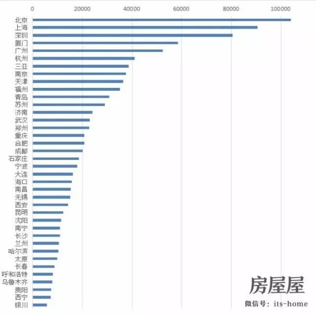 中心城区房价均价超过3万元的共有11个城市,除了上述的北上广深厦杭,还有三亚、南京、天津、福州、青岛5个城市。