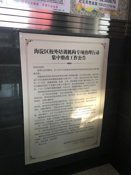 不过,记者在黄庄附近走访时发现,虽然有部分校区暂时停课,但学而思、高思等机构的课程依然照旧,只不过,理想大厦墙上贴出的公告显示,究于消防安全等方面的规定,该校区将进行设施设备和环境的升级改造。
